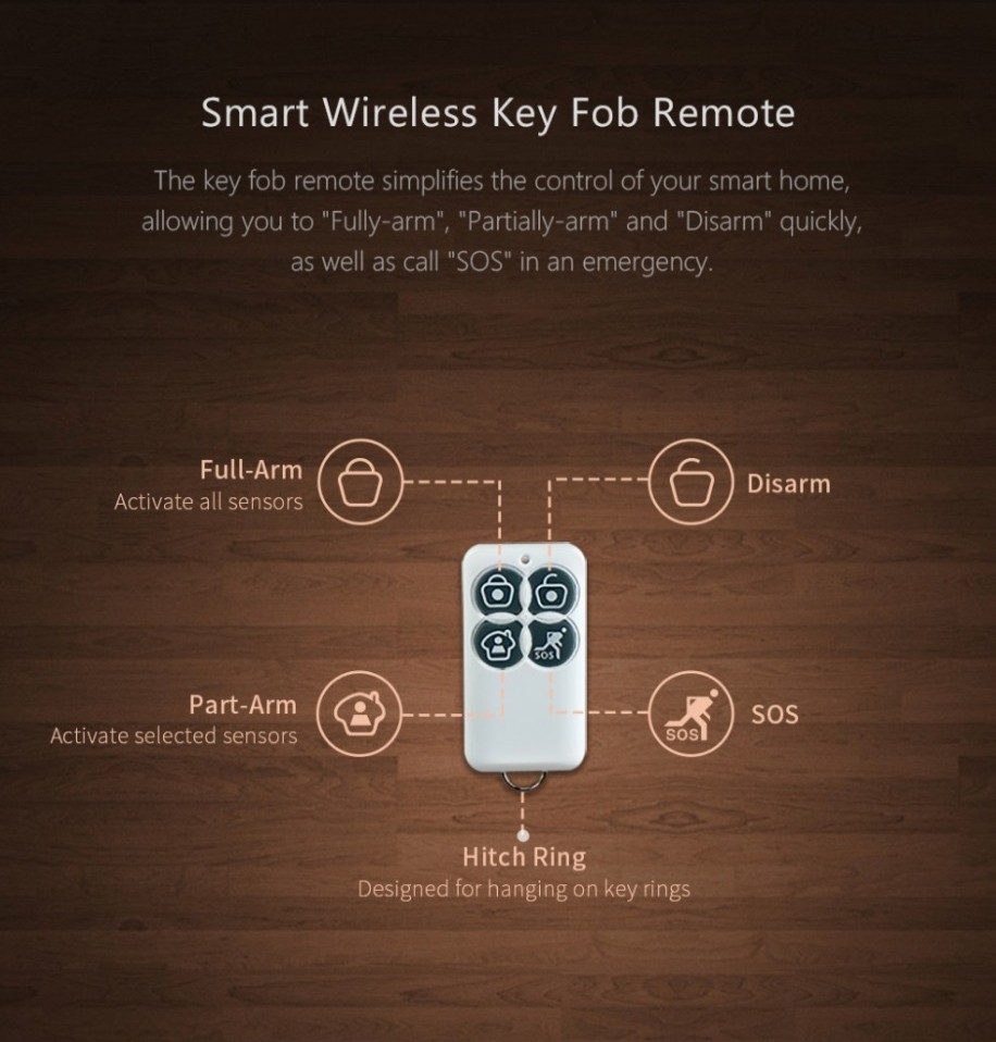 Easily arm, disarm, or activate emergency alerts with a compact smart key fob.