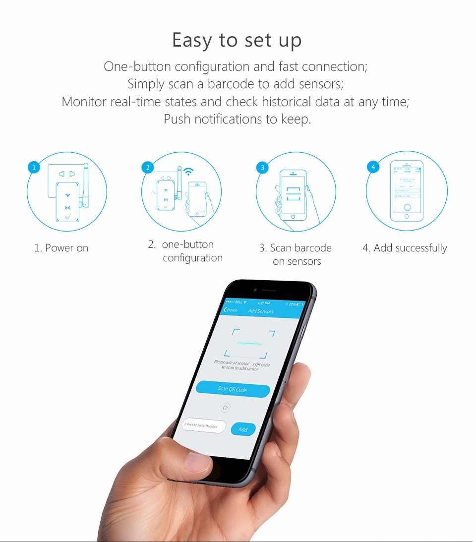Sensors can be added easily through the mobile app, with no complicated wiring or technical expertise required.